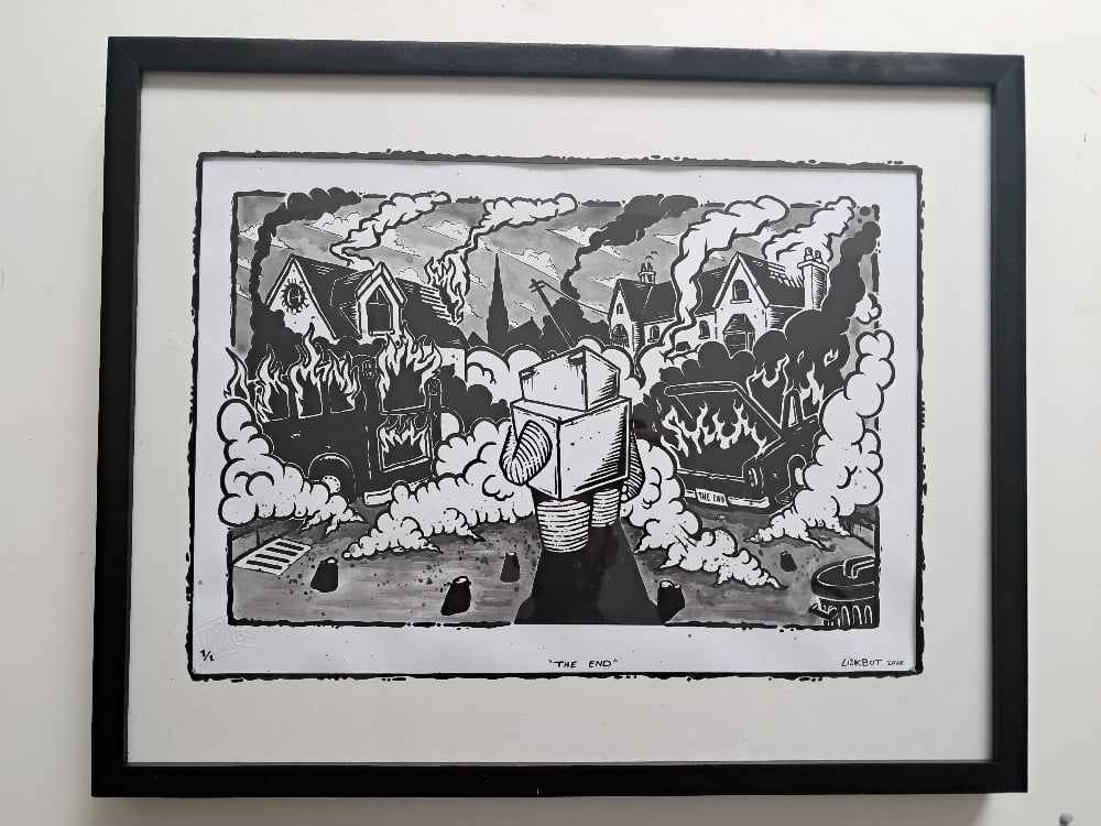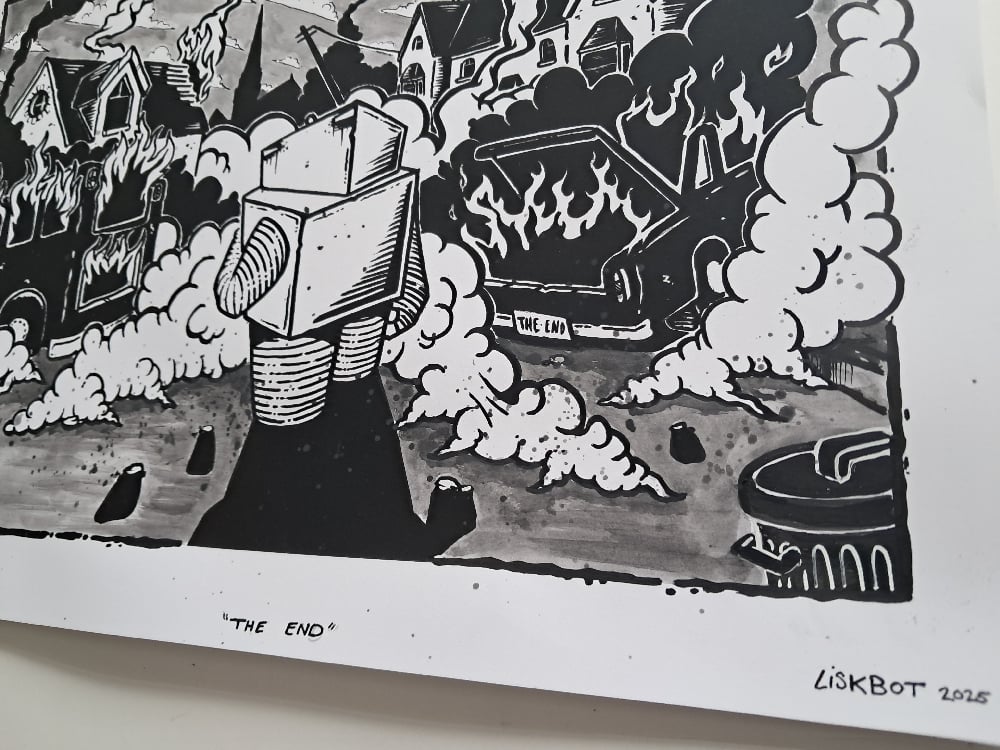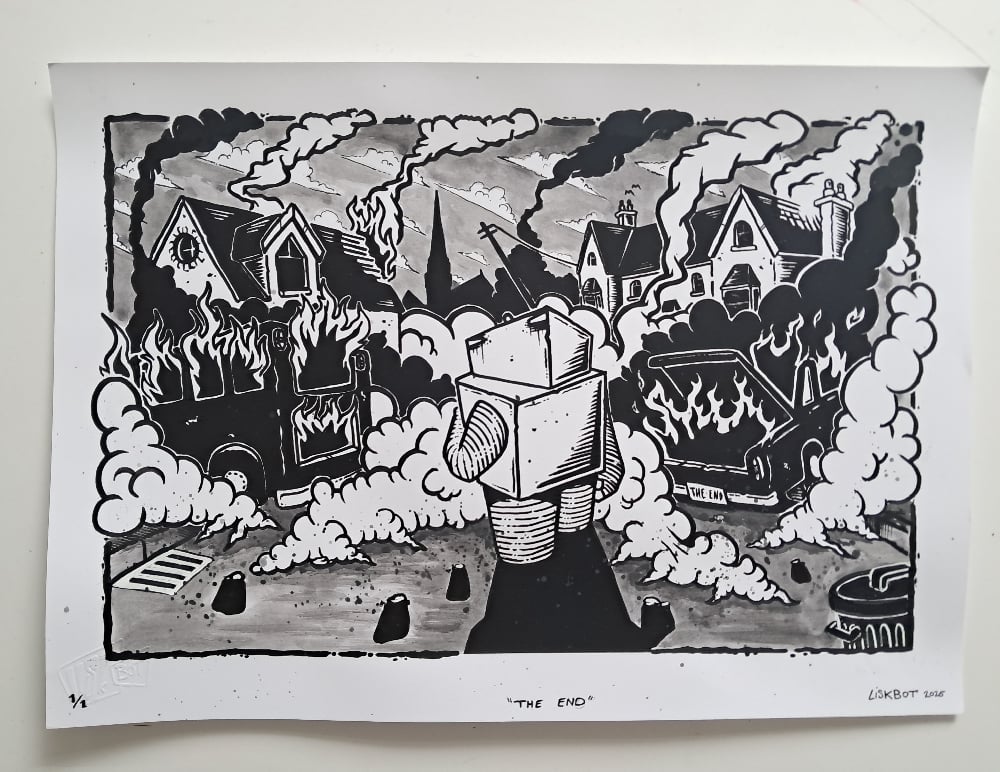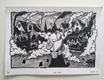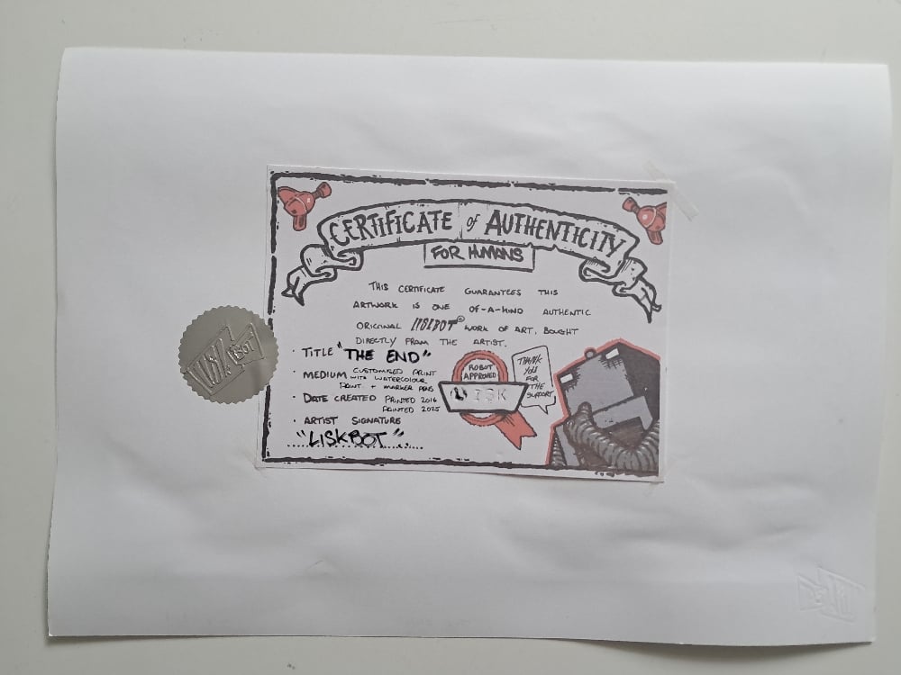Digitally printed on heavy weight paper back in 2016. Lisbot kept it as an artist proof, but its time to let it go. sogot it out the robot vault worked over it with watercolours and inks. Making this old print an origianl piece of art.